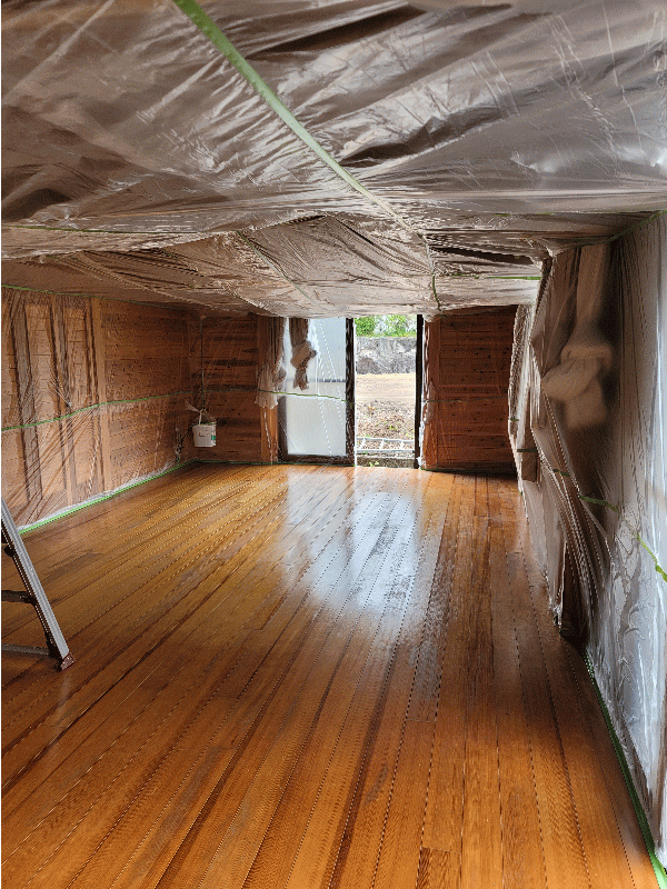 塗り替え前の床 経年劣化の傷・日焼け 塗り替え前の床 痛みでムラが酷いです 旧塗膜を剥がす前に壁や天井に養生します 他の部屋に研磨した粉がいかないように完全なドーム養生です サンダー研磨して古い塗膜を剥がします 完全に剥がしました 着色・下塗り・研磨中 上塗り完了です