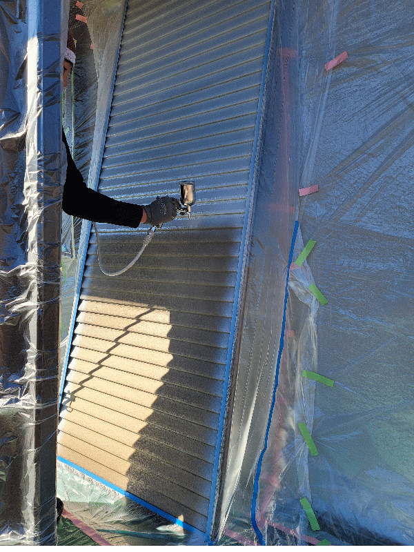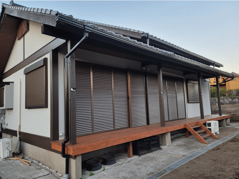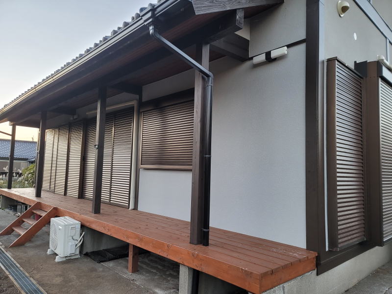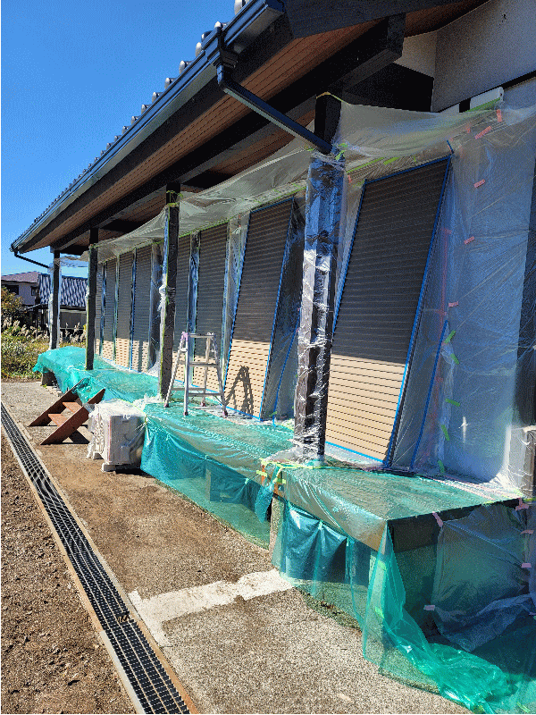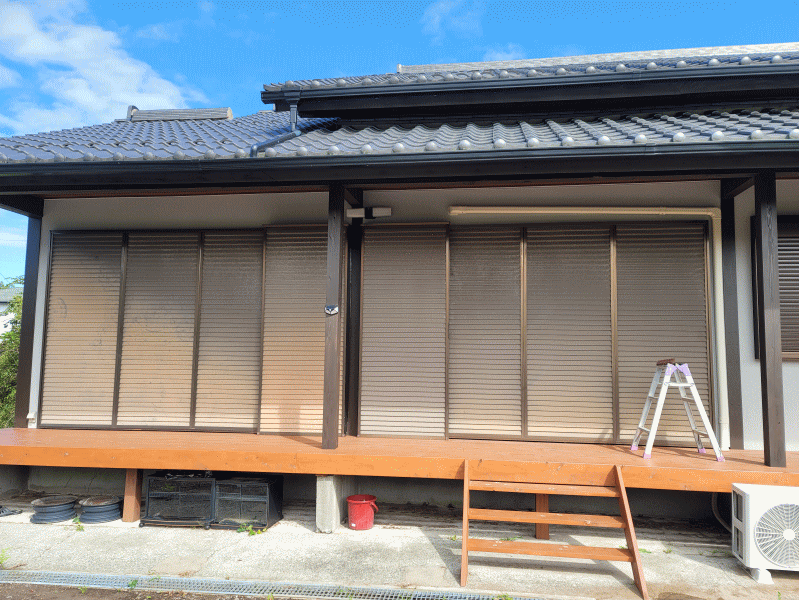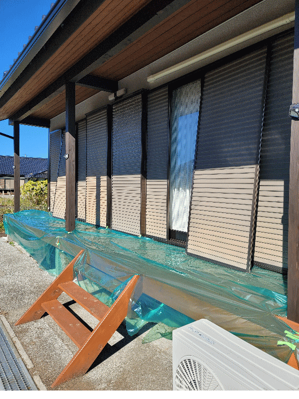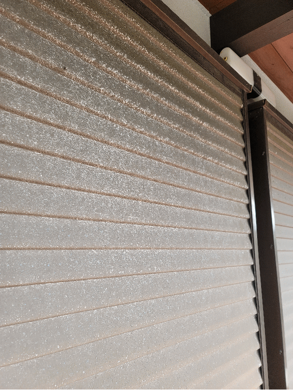 塗装前の雨戸 塗装前の雨戸 痛んで褪せています 塗装後の雨戸 塗装後の雨戸 塗装前の 雨戸アップ写真 かなり痛んでいます 塗装前 雨戸のアップ写真 雨戸などは吹きつけ塗装なので養生を広めにします 吹きつけ中