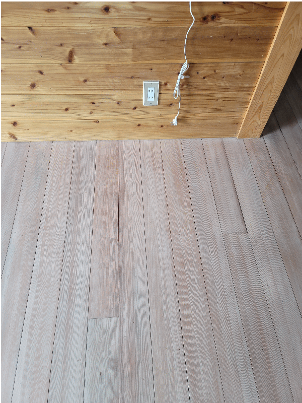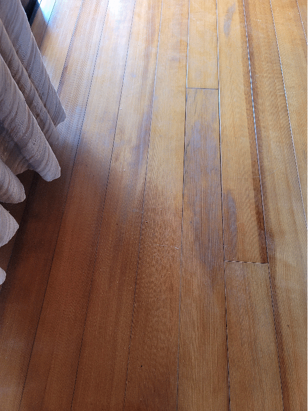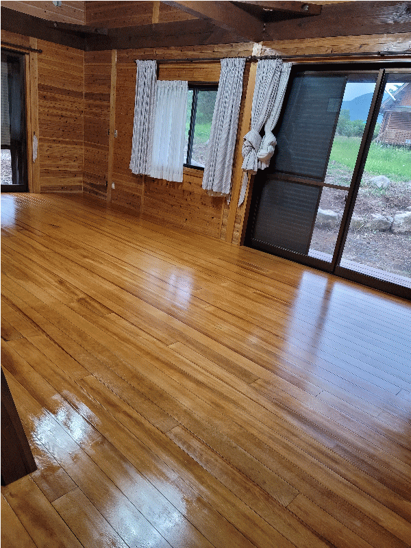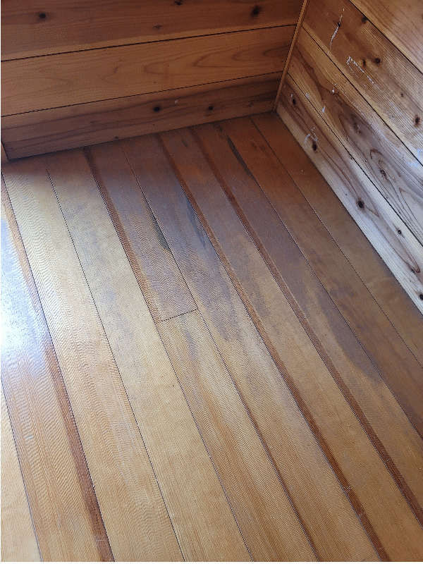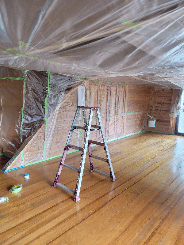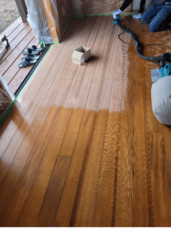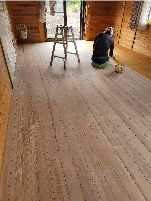 塗り替え前の床 経年劣化の傷・日焼け 塗り替え前の床 痛みでムラが酷いです 旧塗膜を剥がす前に壁や天井に養生します 他の部屋に研磨した粉がいかないように完全なドーム養生です サンダー研磨して古い塗膜を剥がします 完全に剥がしました 着色・下塗り・研磨中 上塗り完了です